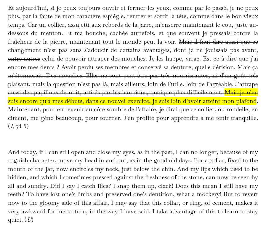 Je travaille sur la façon dont Beckett, dans son va-et-vient entre le français et l’anglais, exprime la notion de commencement. Vaste sujet, que je me contenterai d’effleurer, d’autant que je ne suis évidemment pas spécialiste de Beckett. En procédant à un relevé préliminaire, je découvre ce passage de L’Innommable (1953), traduit par Beckett lui-même (The Unnamable, 1959), et dans laquelle il a supprimé les phrases que j’ai indiquées en les barrant dans le texte-source (français).