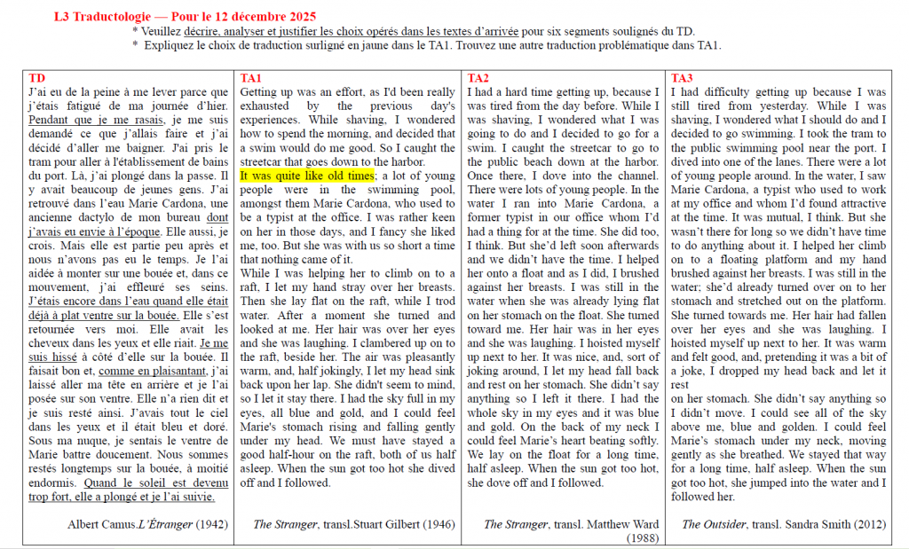 J’évite habituellement de faire travailler mes étudiant·es de L3 Anglais, dans le cours de traductologie, sur des comparaisons de traductions de L’Étranger, car je trouve vraiment cela paresseux.