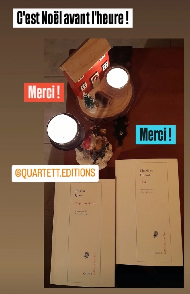 J’ai reçu ce livre samedi, avec l’autre parution de janvier dans la collection Prose libre des éditions Quartett, grâce à Fanny Quément, je suppose, vu qu’elle a préfacé Plak. Les deux livres sont dédicacés par les deux autrices, dont l’une m’a gentiment féminisé·e. Merci beaucoup aux éditions Quartett ; ce n'est pas si souvent que cela qu'on m'envoie des livres [photo : post Instagram de remerciements, 20.12.2025].