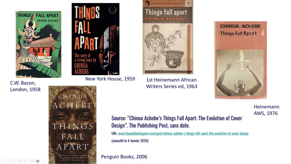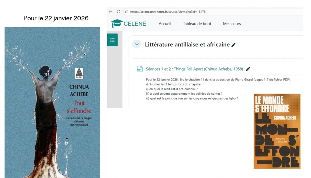 J’ai donc signalé dans mon premier cours qu’on renforce le caractère canonique des « grands textes » en perpétuant leur nécessité (phénomène de cercle vicieux) mais qu’on peut toutefois se mettre d’accord sur le fait qu’une œuvre accède au statut de classique car elle a un impact culturel/historique durable national (Bienvenue chez les ch’tis) ou transnational (la Bible / le Coran / “Imagine” / Guerre et paix). Quant au grand texte c’est un texte dont on considère qu’il est important culturellement ET d’une valeur littéraire difficilement contestable ; c’est avec ce ET que les choses (things) se compliquent, sans pour autant se désagréger (falling apart). Dans le cadre du cours, les cinq « grands textes » permettent de mieux comprendre un champ, et donc, au cours de ces 10 heures, d’ouvrir des perspectives de réflexion – et de lectures – dans le champ des littératures africaines et antillaises.