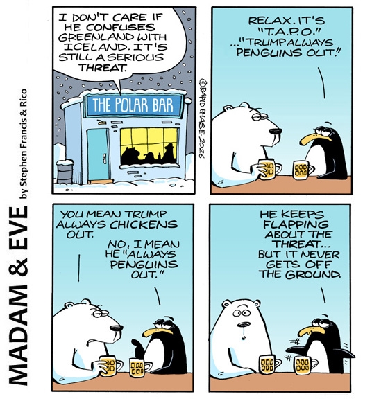 Dans ce cartoon de Madam & Eve (cliquer pour agrandir), un des nouveaux personnages récurrents, le manchot cynique – qui est d’abord apparu comme conseiller de Donald Trump pour tenter d’apaiser la situation diplomatique avec l’Afrique du Sud – boit un verre avec un ours polaire groenlandais inquiet des menaces d’invasion états-uniennes.
